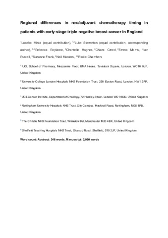 Title: | Regional differences in neo/adjuvant chemotherapy timing in patients with early-stage triple negative breast cancer in England |