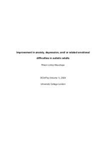 Overview Part one is a systematic review examining the literature on individuals who are initially diagnosed with autism but no longer meet the criteria at a later stage when reassessed. It considers the findings in relation to a set of hypotheses as to the nature of this: (1) deficit-recovery model, (2) false positive hypothesis, (3) false negative compensation hypothesis, (4) continuum hypothesis. Links to psychological well-being are discussed. Part two is a qualitative empirical study exploring 15 autistic adults’ lived experiences of improvements in depression, anxiety and/ or related emotional difficulties. This is in recognition that autistic people experience a range of related emotional concepts such as masking, burnout, meltdowns, and social camouflaging, which may not be captured by existing mental health measures. Semi-structured interviews were conducted, and four overarching themes identified: personal factors, interpersonal factors, environmental factors, and strategies/ support. Implications and suggestions for future research are considered. Part three is a critical appraisal of the research process. This includes further reflections on ethical considerations including the role of a non-autistic researcher, accessibility, collaboration with experts by experience, language sensitivity, methodological decisions, and the value of the research across different domains, including personal and professional impact.
