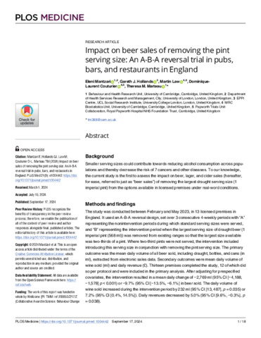 Title: | Impact on beer sales of removing the pint serving size: An A-B-A reversal trial in pubs, bars, and restaurants in England |
