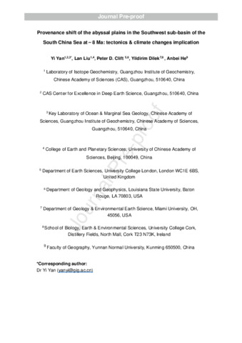| Title: | Provenance shift of the abyssal plains in the Southwest sub-basin of the South China Sea at ∼ 8 Ma: Tectonics & climate changes implication |