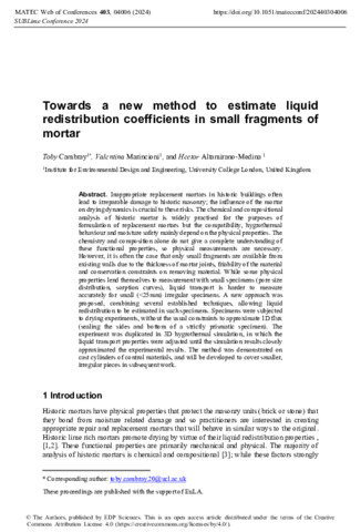 Title: | Towards a new method to estimate liquid redistribution coefficients in small fragments of mortar |
