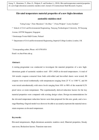 A testing programme was conducted to investigate the material properties of a new high-chromium grade of austenitic stainless steel - EN 1.4420 at elevated temperatures. A total of 164 tensile coupons extracted from both cold-rolled and hot-rolled sheets were tested; 80 coupons were tested isothermally with temperatures ranging from 25 °C to 1100 °C, and 84 were tested anisothermally with stress levels ranging from 10% to 90% of the material 0.2% proof stress at room temperature. The experimentally derived reduction factors for the key material properties were compared with existing design values. Design recommendations for the elevated temperature reduction factors were then proposed for this new grade, and a two-stage Ramberg–Osgood model was shown to be able to accurately represent the material stress–strain response at elevated temperature.