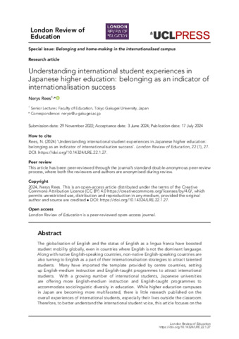 | Title: | Understanding international student experiences in Japanese higher education: belonging as an indicator of internationalisation success |