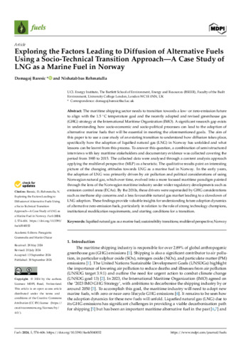 Title: | Exploring the Factors Leading to Diffusion of Alternative Fuels Using a Socio-Technical Transition Approach—A Case Study of LNG as a Marine Fuel in Norway |