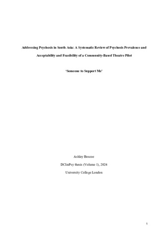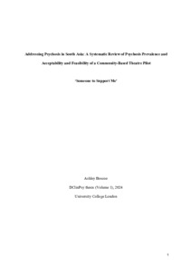 | Title: | Addressing Psychosis in South Asia: A Systematic Review of Psychosis Prevalence and Acceptability and Feasibility of a Community-Based Theatre Pilot ‘Someone to Support Me’ |