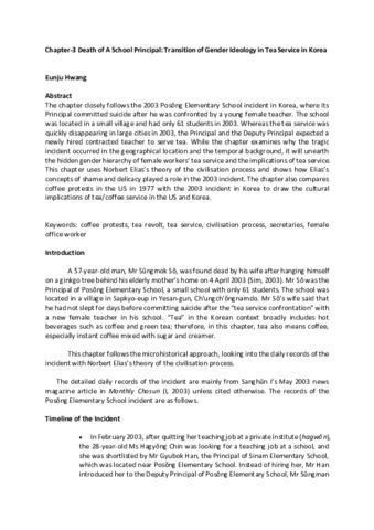 The chapter closely follows the 2003 Posŏng Elementary School incident in Korea, where its Principal committed suicide after he was confronted by a young female teacher. The school was located in a small village and had only 61 students in 2003. Whereas the tea service was quickly disappearing in large cities in 2003, the Principal and the Deputy Principal expected a newly hired contracted teacher to serve tea. While the chapter examines why the tragic incident occurred in the geographical location and the temporal background, it will unearth the hidden gender hierarchy of female workers’ tea service and the implications of tea service. This chapter uses Norbert Elias’s theory of the civilisation process and shows how Elias’s concepts of shame and delicacy played a role in the 2003 incident. The chapter also compares coffee protests in the United States in 1977 with the 2003 incident in Korea to draw the cultural implications of tea/coffee service in the United States and Korea.