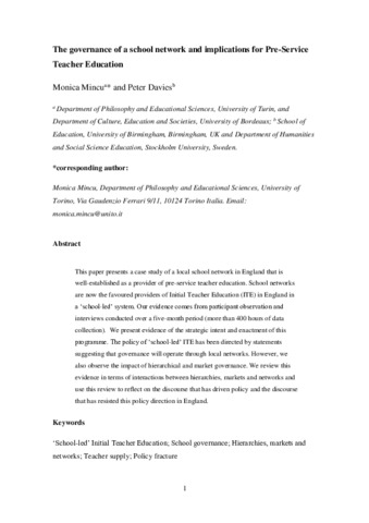 | Keywords: | ‘School-led’ Initial Teacher Education; School governance; Hierarchies, markets and networks; Teacher supply; Policy fracture |