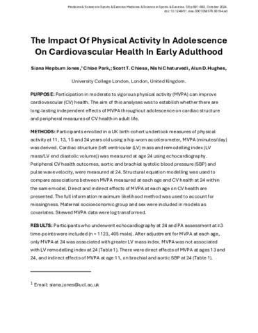 PURPOSE: Participation in moderate to vigorous physical activity (MVPA) can improve cardiovascular (CV) health. The aim of this analyses was to establish whether there are long-lasting independent effects of MVPA throughout adolescence on cardiac structure and peripheral measures of CV health in adult life. // METHODS: Participants enrolled in a UK birth cohort undertook measures of physical activity at 11, 13, 15 and 24 years old using a hip-worn accelerometer, MVPA (minutes/day) was derived. Cardiac structure (left ventricular (LV) mass and remodelling index (LV mass/LV end diastolic volume)) was measured at age 24 using echocardiography. Peripheral CV health outcomes, aortic and brachial systolic blood pressure (SBP) and pulse wave velocity, were measured at 24. Structural equation modelling was used to compare associations between MVPA measured at each age and CV health at 24 within the same model. Direct and indirect effects of MVPA at each age on CV health are presented. The full information maximum likelihood method was used to account for missingness. Maternal socioeconomic group and sex were included in models as covariates. Skewed MVPA data were log transformed. // RESULTS: Participants who underwent echocardiography at 24 and PA assessment at ≥3 time-points were included (n = 1123, 405 male). After adjustment for MVPA at each age, only MVPA at 24 was associated with greater LV mass index. MVPA was not associated with LV remodelling index at 24 (Table 1). There were direct effects of MVPA at ages 13 and 24, and indirect effects of MVPA at age 11, on brachial and aortic SBP at 24 (Table 1). // CONCLUSION: These data provide evidence that MVPA at age 13 is associated with lower aortic and brachial SBP in adult life, even after current activity status is accounted for, implying that exercise in early adolescence has long-term benefits for BP in adulthood. These data also show that increased MVPA at age 24 is associated with a greater LV mass but without adverse LV remodelling.