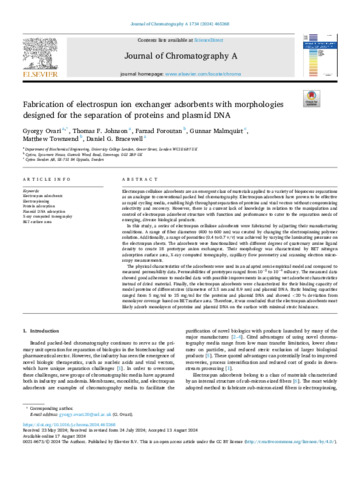 | Title: | Fabrication of electrospun ion exchanger adsorbents with morphologies designed for the separation of proteins and plasmid DNA |