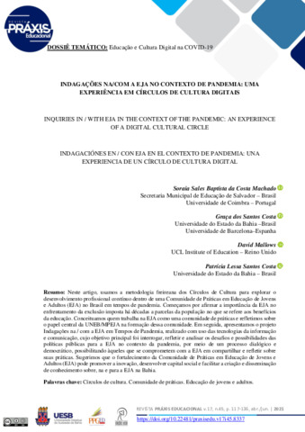 Title: | Indagações na/com a EJA no contexto de pandemia: uma experiência em círculos de cultura digitais |