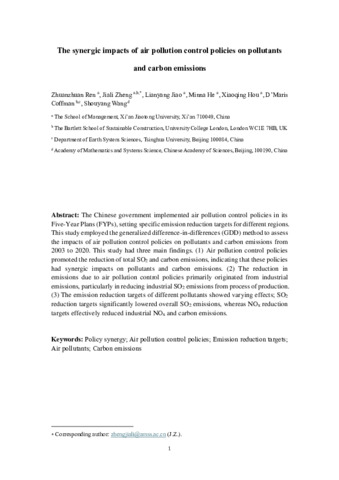 | Title: | The synergic impacts of air pollution control policies on pollutants and carbon emissions |