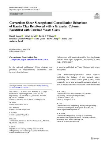| Title: | Correction: Shear Strength and Consolidation Behaviour of Kaolin Clay Reinforced with a Granular Column Backfilled with Crushed Waste Glass |