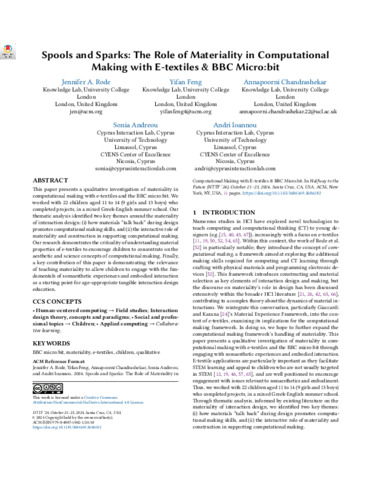 | Title: | Spools and Sparks: The Role of Materiality in Computational Making with E-textiles and BBC Micro:bit |