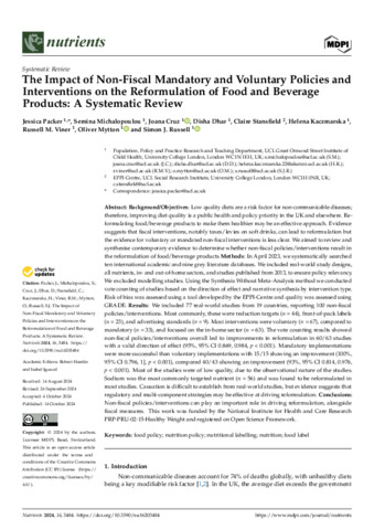 Title: | The Impact of Non-Fiscal Mandatory and Voluntary Policies and Interventions on the Reformulation of Food and Beverage Products: A Systematic Review |