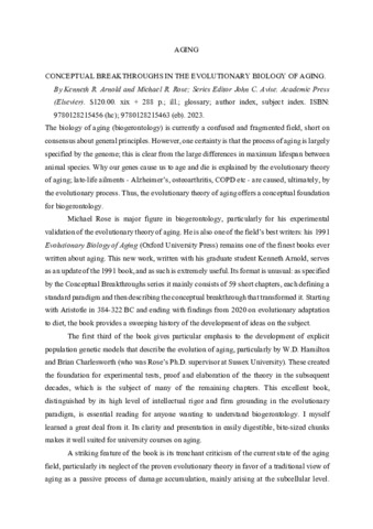 Conceptual Breakthroughs in the Evolutionary Biology of Aging. Conceptual Breakthroughs Series. By Kenneth R. Arnold and Michael R. Rose; edited by John C. Avise. Academic Press. Amsterdam (The Netherlands) and New York: Elsevier. $102.00 (paper). xix + 288 p.; ill.; author index and index. ISBN: 978-0-12-821545-6. 2023.