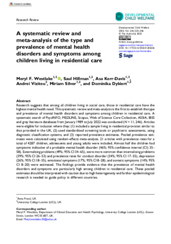 Title: | A systematic review and meta-analysis of the type and prevalence of mental health disorders and symptoms among children living in residential care |