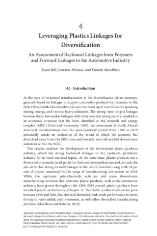 The chapter considers the role of linkages, lead firm strategies, industrial policies, and value chain governance in the performance of the South African plastic products industry. The extent to which the linkages of the plastic products sub-sector backwards with the polymers industry, and forwards to plastic automotive components, have influenced the performance of the industry is assessed. The forward linkages to the automotive industry are assessed through a comparative assessment of technological capability accumulation in South Africa with its relatively more successful upper-middle-income counterpart, Thailand. The analysis shows that vertical integration and horizontal collaborations through clusters, as well as the different roles played by multinational corporations and the state, have exerted a stronger influence on the accumulation of capabilities in Thailand, compared with South Africa. The assessment of backward linkages to polymers shows how the linkage development in South Africa has been undermined by market power in the upstream polymers industry. This is coupled with a failure of industrial policy to support diversified industries such as plastic products, including through addressing the challenges related to input prices and supporting the accumulation of capabilities.