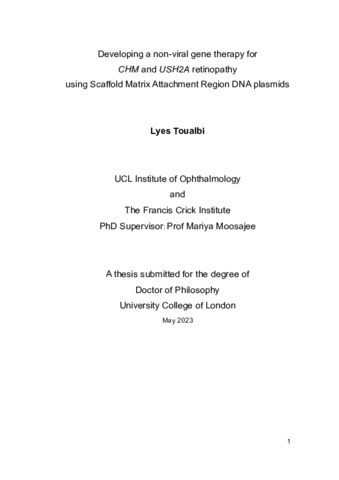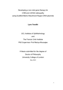 Title: | Developing a non-viral gene therapy for CHM and USH2A retinopathy using Scaffold Matrix Attachment Region DNA plasmids |