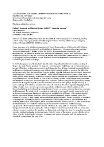'Kolkata's Durgapuja Festival and Thinking Through UNESCO's 'Intangible Heritage' in Special Issue 'Space and Heritage: On the Generativity of Environing Worlds'.