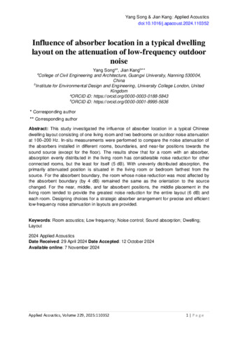| Title: | Influence of absorber location in a typical dwelling layout on the attenuation of low-frequency outdoor noise |