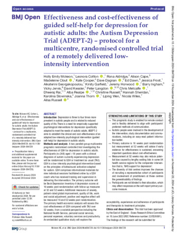 Title: | Effectiveness and cost-effectiveness of guided self-help for depression for autistic adults: the Autism Depression Trial (ADEPT-2) – protocol for a multicentre, randomised controlled trial of a remotely delivered low-intensity intervention |