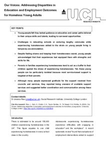 | Title: | Our Voices: Addressing Disparities in Education and Employment Outcomes for Homeless Young Adults_Research Insights |