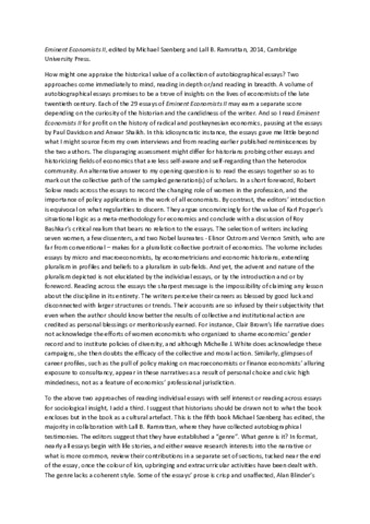 How might one appraise the historical value of a collection of autobiographical essays? Two approaches come immediately to mind, reading in depth or/and reading in breadth. A volume of autobiographical essays promises to be a trove of insights on the lives of economists of the late twentieth century. Each of the 29 essays of Eminent Economists II may earn a separate score depending on the curiosity of the historian and the candidness of the writer. And so I read Eminent Economists II for profit on the history of radical and postkeynesian economics, pausing at the essays by Paul Davidson and Anwar Shaikh. In this idiosyncratic instance, the essays gave me little beyond what I might source from my own interviews and from reading earlier published reminiscences by the two authors. The disparaging assessment might differ for historians probing other essays and historicizing fields of economics that are less self-aware and self-regarding than the heterodox community.