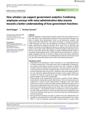 Title: | How scholars can support government analytics: Combining employee surveys with more administrative data sources towards a better understanding of how government functions |