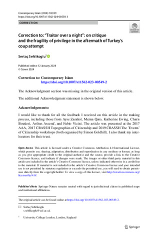 | Title: | Correction to: “Traitor over a night”: on critique and the fragility of privilege in the aftermath of Turkey’s coup attempt |