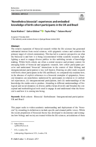 Title: | ‘Nonetheless biosocial’: experiences and embodied knowledge of birth cohort participants in the UK and Brazil |