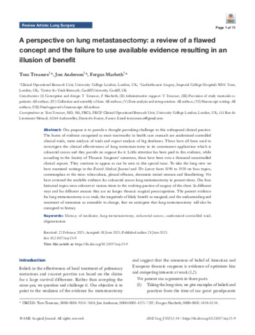 Title: | A perspective on lung metastasectomy: a review of a flawed concept and the failure to use available evidence resulting in an illusion of benefit |
