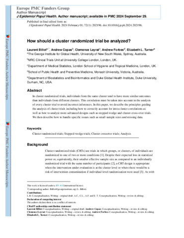 Keywords: | Cluster randomized trials; Stepped-wedge trials; Cluster crossover trials; Analysis |