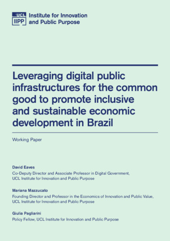 The Government of Brazil is implementing an agenda of economic transformation that aims to bring economic, social and environmental priorities into alignment. Realising its full potential will require a parallel agenda of state transformation, to empower the public service with the policies, tools, institutions and capabilities needed to successfully direct growth and shape markets that work for the people of Brazil and for the planet. Thoughtful design and governance of Digital Public Infrastructures (DPI) are a critical part of this agenda. DPI — shared digital systems that are secure, interoperable, based on open standards and promote access to services for everyone — can be designed according to “common good” principles and oriented around policy priorities. This working paper explores the challenges and opportunities of leveraging DPI to support Brazil’s economic transformation, building on Brazil’s history of digital transformation initiatives. It looks at what this approach could mean for Brazil’s Rural Environmental Registry (CAR) as an illustrative case study. This working paper was used to inform a virtual workshop held remotely on September 20th, 2024, with representatives of 29 organizations. It has been updated to reflect the insights shared by participants. This working paper was written as part of a project funded by the Open Society Foundations, led by Professor Mariana Mazzucato (PI) with Professor David Eaves as Co-PI of the Digital Public Infrastructure workstream, as part of a partnership between the Institute for Innovation and Public Purpose (IIPP) and Brazil’s Ministry of Management and Innovation in Public Services (MGI).