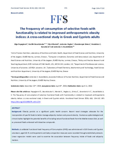 | Title: | The frequency of consumption of selective foods with functionality is related to improved anthropometric obesity indices: A cross-sectional study in Greek and Cypriots adults |