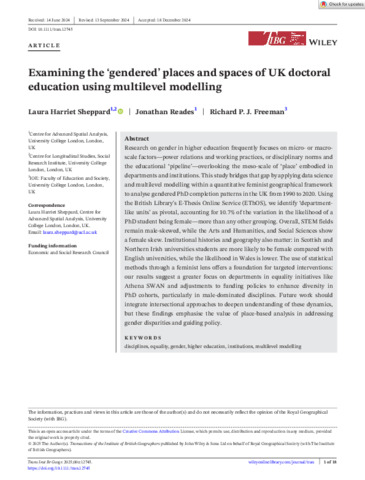 Reades_Trans Inst British Geog - 2025 - Sheppard - Examining the gendered places and spaces of UK doctoral education using.pdf Download (1MB) | Preview |