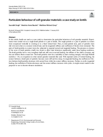 Title: | Particulate behaviour of soft granular materials: a case study on lentils |