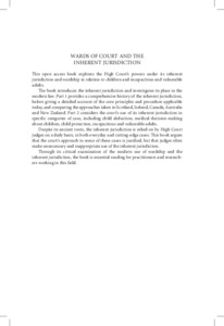 This open access book explores the High Court's powers under its inherent jurisdiction and wardship in relation to children and incapacitous and vulnerable adults. The book introduces the inherent jurisdiction and investigates its place in the modern law. Part 1 provides a comprehensive history of the inherent jurisdiction, before giving a detailed account of the core principles and procedure applicable today, and comparing the approaches taken in Scotland, Ireland, Canada, Australia and New Zealand. Part 2 considers the court's use of its inherent jurisdiction in specific categories of case, including child abduction, medical decision-making about children, child protection, incapacitous and vulnerable adults. Despite its ancient roots, the inherent jurisdiction is relied on by High Court judges on a daily basis, in both everyday and cutting-edge cases. This book argues that the court's approach to some of these cases is justified, but that judges often make unnecessary and inappropriate use of the inherent jurisdiction. Through its critical examination of the modern use of wardship and the inherent jurisdiction, the book is essential reading for practitioners and researchers working in this field.