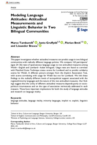 This paper investigates whether attitudinal measures can predict usage in two bilingual communities with radically different language policies. We compare 163 participants’ (ages 24–36) rates of spontaneous language usage to two attitudinal measures among Welsh—English and Lombard—Italian bilinguals. Usage rates are found to correlate with Matched Guise Technique status scores for Lombard and to predict solidarity scores for Welsh. A different picture emerges from the Implicit Association Test, with scores correlating with usage for Welsh but not for Lombard. We link these findings to the radically different levels of sociopolitical support associated with the regional/minority languages and the nature of the two attitudinal measures. Our findings suggest that the utility of different attitudinal measures depends partly on sociopolitical circumstances and on the type of association intrinsically addressed in each measure. These have important implications for both the study of language attitudes and research on language vitality.
