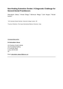 Introduction: In the UK, more than 18 million extractions are performed annually. Healing after extraction is often uneventful, but there are rare cases where weeks or months pass and an extraction socket does not heal. // Aim: The aim of this study is to provide a review of cases in which a non-healing extraction socket is attributed to a serious systemic disease or malignancy, or an adverse consequence of systemic therapy. // Methods: PubMed, Embase, Scopus, ProQuest and Google Scholar databases were searched using the term ‘non-healing extraction socket'. Results were subsequently restricted to humans and English language. // Results: A total of 50 cases of non-healing extraction socket (28 women and 22 men with an average age of 55.2 years) were identified. The total number of extracted teeth was 71. Malignancy (primary and metastatic) was the most common definitive diagnosis, followed by medication-related osteonecrosis of the jaw. // Discussion: There are cases in which an extraction socket does not show any sign of proper healing, even after a lengthy period. Some of these cases are caused by primary or metastatic cancer, or other serious disorders. // Conclusion: Dentists should be vigilant when encountering a non-healing extraction socket, as this may herald an undiagnosed serious disease or malignancy.