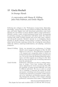 This chapter discusses the performances of Swiss-based performance artist Gisela Hochuli, particularly focusing on her series titled In Strange Hands. The series involves the interpretation and performance of instructions received from the registrants to the project’s annual colloquium. Hochuli explains that performance instructions offer the possibility of different executions and individual authorship, which sparked her interest in collecting and incorporating them into her work. The first performance consisted of three instructions, while the second performance involved around twenty instructions. The evolving thinking in conception and execution led to different approaches, with the first performance being more immersive and the second a more sequential performance at a table. Hochuli reflects on the role of external forces, such as nature or the audience, in shaping performances, and the transformative experience for both the artist and the spectators. The text also touches on the significance of documenting and archiving performance art for reflection, understanding different approaches, and inspiring future interpretations. Video documentation plays a crucial role in capturing performances and aiding in reflection and development. Hochuli emphasizes the potential for reenactment and the invitation for others to develop their own performances based on the instructions.