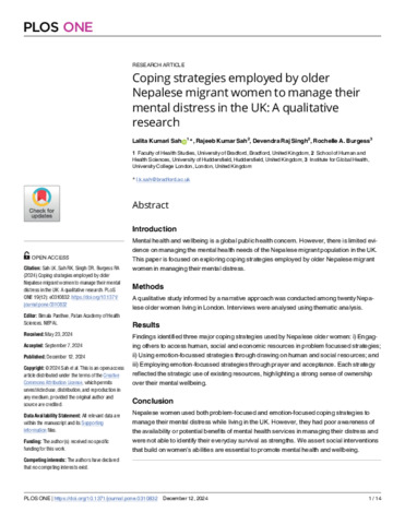 Title: | Coping strategies employed by older Nepalese migrant women to manage their mental distress in the UK: A qualitative research |