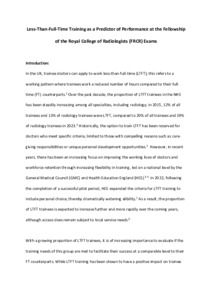 Aim: The proportion of less-than-full-time (LTFT) trainees in the National Health Service has been steadily increasing over the past decade. To date, there has been a paucity of data assessing their postgraduate training outcomes. We aimed to evaluate whether LTFT trainees show group-level differences in performance at the Fellowship of the Royal College of Radiologists (FRCR) exams, relative to their full-time counterparts. / Materials and methods: Retrospective cohort study of UK-trainees attempting the FRCR Part 1 (n=1,785) and 2B (n=1,435) examinations between 2014 and 2021, and the 2A examination between 2018 and 2021 (n=745), with linked sociodemographic variables. Chi-square tests assessed univariate associations between LTFT-training, region of primary medical degree, age, and gender, with exam performance. Multivariate regression analyses examined associations with FRCR performance after adjusting for other variables. / Results: During the study period, 3.0% (55/1,785) of Part 1 candidates were LTFT, compared to 10.0% (75/745) of 2A candidates and 13.2% (190/1,435) of 2B candidates. Women and those over 34 were more likely to be LTFT (p<0.05). LTFT trainees were nearly half as likely to pass the 2A (OR:0.51, CI:0.30–0.89) and 2B (OR:0.55, CI:0.38–0.80) exams after adjusting for other variables. Significant associations were also observed for FRCR pass rates with ethnicity, age at exam and region of primary medical degree. / Conclusion: LTFT trainees have lower pass rates at the FRCR 2A and 2B exams after adjusting for other demographic factors. Royal Colleges and Training Programmes should explore the causes of this award gap and consider national and local efforts to facilitate equity in training for these trainees.
