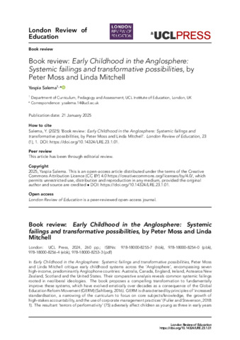 Title: | Book review: Early Childhood in the Anglosphere: Systemic failings and transformative possibilities, by Peter Moss and Linda Mitchell |
