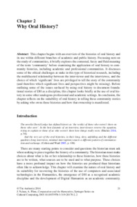This chapter begins with an overview of the histories of oral history and its use within different branches of academic and public history. Focussing next on the study of communities, it briefly explores the contested, fuzzy and fluid meaning of the term ‘community’ before examining the application of oral history to community histories, including academic and professional communities. It discusses some of the ethical challenges at stake in this type of historical research, including the multifaceted relationship between the interviewer and the interviewee, and the choice of which ‘significant’ lives are privileged to tell the story of the community (and therefore which significant lives and perspectives might be missing). Before outlining some of the issues surfaced by using oral history to document foundational stories of DH as a discipline, this chapter looks briefly at the use of oral history in some other analogous professional and academic settings. In conclusion, the chapter reflects on the suitability of oral history in telling these community stories by asking who owns these histories and how that ownership is manifested.