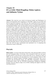 This interview was carried out between London and Washington via skype on 18 September 2013, beginning at 17:05 GMT. Agüera was provided with the core questions in advance of the interview. She recalls that her first encounters with computing and DH came about through her post in National Endowment for the Humanities (NEH), where she had joined a division that funded the preparation of research tools, reference works and scholarly editions. Thus, she administered grants to a large number of projects that worked, at a relatively early stage, at the interface of Humanities and Computing, for example, Thesaurus Linguae Graecae. In this interview she recalls some of the changes that the division where she worked made to its operating procedures in order to incorporate digital projects. For example, in 1979, a section that was added to application materials asking relevant projects to provide a rationale for their proposed use of computing or word processing. She also discusses issues like sustainability that became apparent over the longer term and reflects on some of the wider trends she saw during her career. Computing was initially taken up by fields like Classics and lexicography that needed to manage and interrogate masses of data and thus had a clear application for it. She contrasts this with the more experimental and exploratory use of computing that characterises much of DH today.