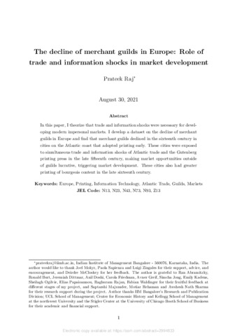 In this paper, I theorize that trade and information shocks were necessary for developing modern impersonal markets. I develop a dataset on the decline of merchant guilds in Europe and find that merchant guilds declined in the sixteenth century in cities on the Atlantic coast that adopted printing early. These cities were exposed to simultaneous trade and information shocks of Atlantic trade and the Gutenberg printing press in the late fifteenth century, making market opportunities outside of guilds lucrative, triggering market development. These cities also had greater printing of “bourgeois” content in the late sixteenth century.