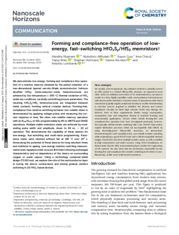 | Title: | Forming and compliance-free operation of low-energy, fast-switching HfOxSy/HfS2 memristors |