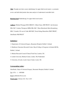 Title: | Neoadjuvant Short-Course Radiotherapy for Upper Third Rectal Tumors: Systematic Review and Individual Patient Data Metaanalysis of Randomized Controlled Trials |