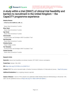 Title: | A study within a trial (SWAT) of clinical trial feasibility and barriers to recruitment in the United Kingdom – the CapaCiTY programme experience |