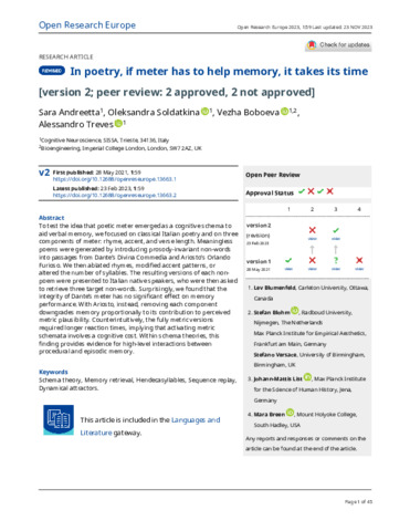 Title: | In poetry, if meter has to help memory, it takes its time [version 2; peer review: 2 approved, 2 not approved] |